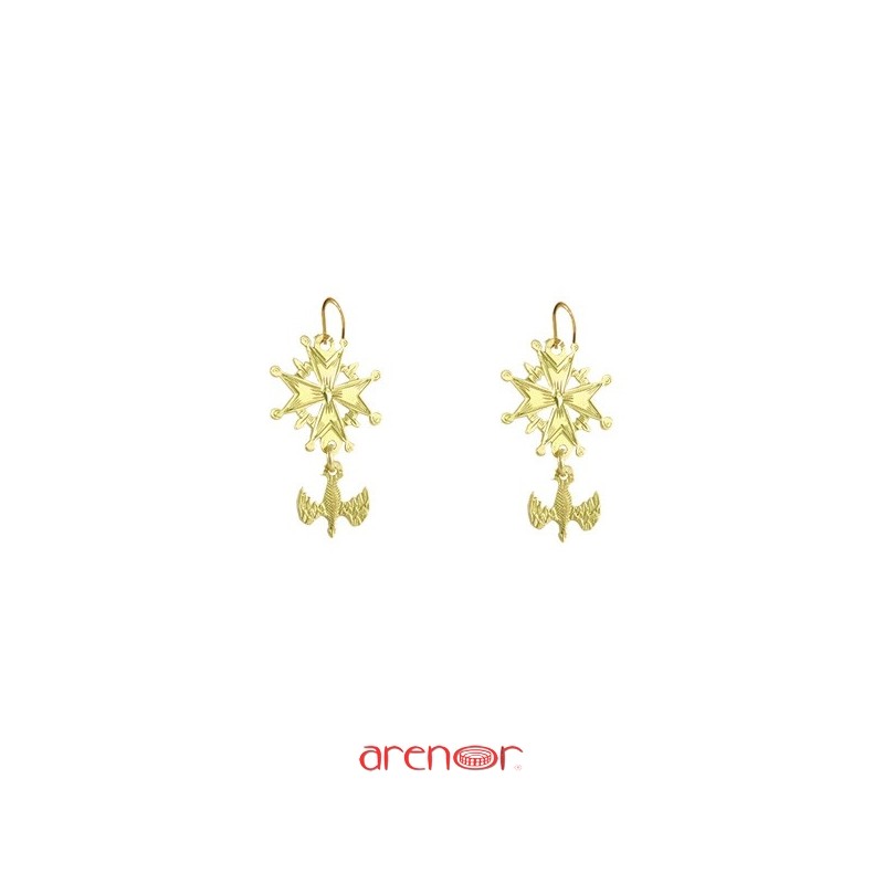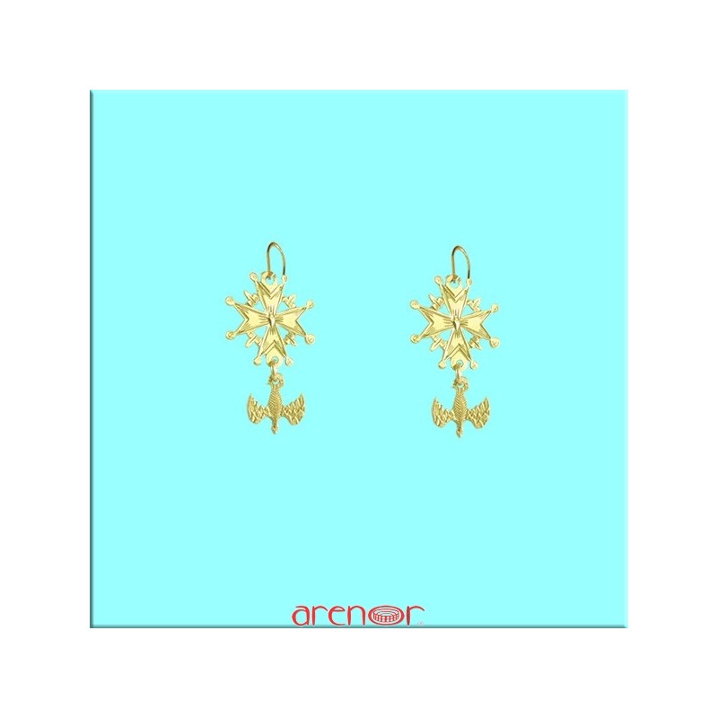 Boucles d'oreilles croix huguenote avec colombe en or jaune 750.